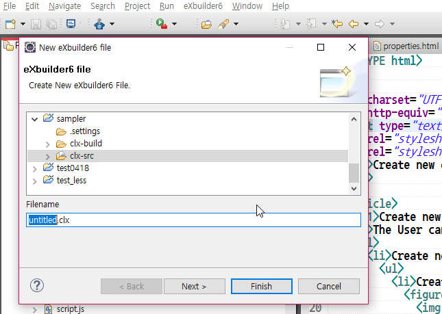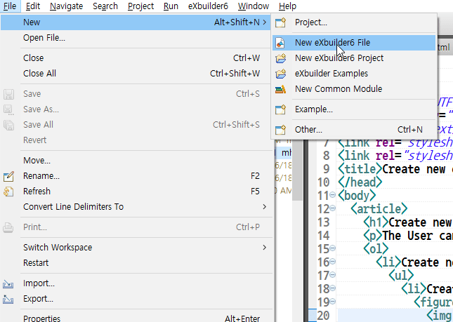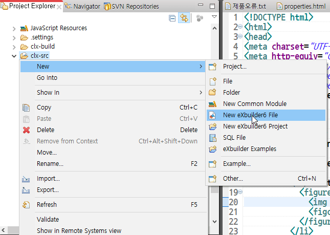 - Create new file by selecting Project or folder from explorer using context menu or File > New > New eXBuilder6 file from global menu.