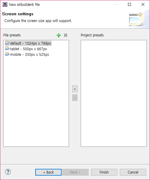 New eXBuilder6 file creation Wizard 1 - Next, the user can build a screen in the screen configuration page, which is supported by an App in the Interactive Layout. PC, tablet, and mobile are provided by default. Once the settings are completed press [Finish] to create file.