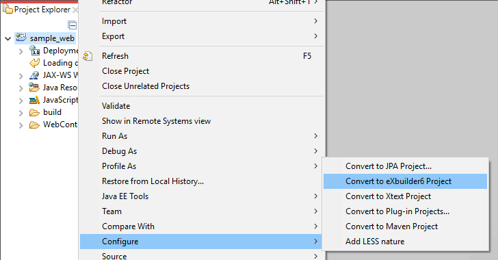 - After selecting the web project to which the eXBuilder6 project will be integrated, select Configure > Convert to eXBuilder6 Project from the pop-up menu.